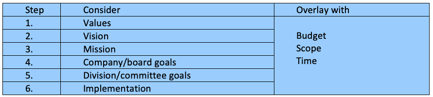 - The Board should ask, “Does the proposed initiative align with our organization's Values By first weighing the decision against the company's Values, you rapidly cull ideas that will not fit right at the beginning of the decision process.
